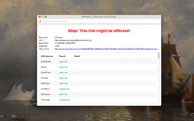 “用于下载的病毒检查器”扩展通过针对 68 种防病毒解决方案检查所有下载链接,为您的浏览体验提供了额外的安全级别。扩展需要零配置。提交新的下载请求后,下载链接将发送到 VirusTotal 网络服务并进行病毒检查。报告准备好后,扩展程序会评估响应并通知您链接是否存在威胁。如果对该链接的正面响应超过 p 定义,则会出现一个警告窗口,通知您此下载可能存在的威胁。您可以决定允许或拒绝此下载。