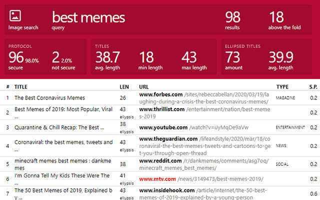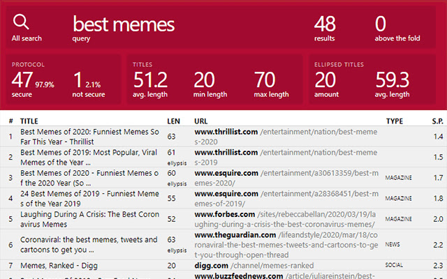 - 带有在 SERP、URL、标题和“滚动页面”位置中的位置的完整结果列表。