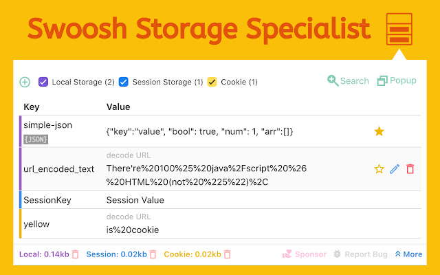 - Local Storage, Session Storage 和 Cookie 3合1编辑器,增删改查搜索收藏及批量操作