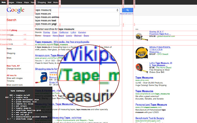 Tape 是一种用于像素完美网站开发的工具。它可以让您放下与页面内容智能对齐的指南(并在滚动或调整大小时坚持下去),并帮助您轻松测量元素的位置和大小。它知道边框和填充,甚至会对齐文本的基线。有屏幕帮助、显示用户定义的列和行网格的能力、用于像素完美测量的内置放大镜,并且可以通过一次按键快速打开和关闭所有指南。