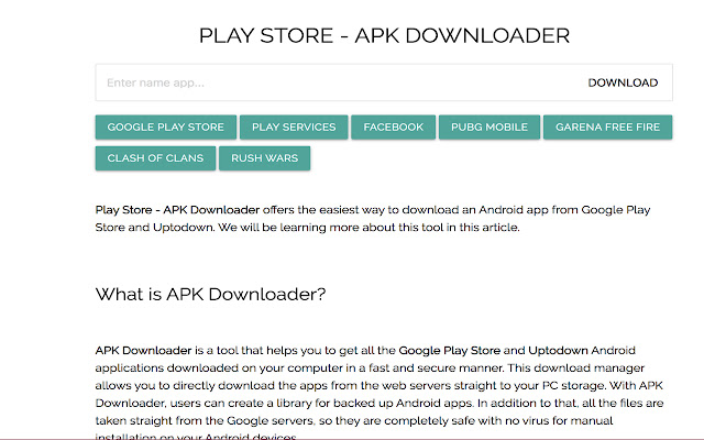 此扩展允许用户免费下载游戏和应用程序的 APK。简单的工作,只需输入您要下载APK文件的应用程序名称并pss下载按钮即可。
