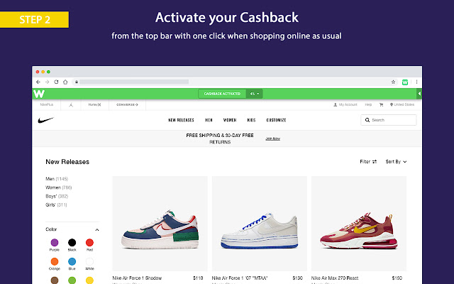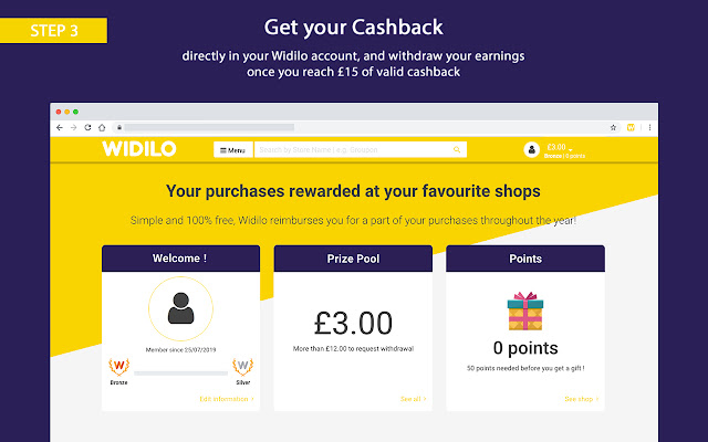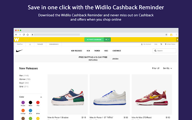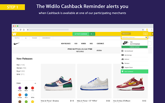 使用 Widilo Cashback Reminder 在线购物时,一键即可获得所有购买的现金返还