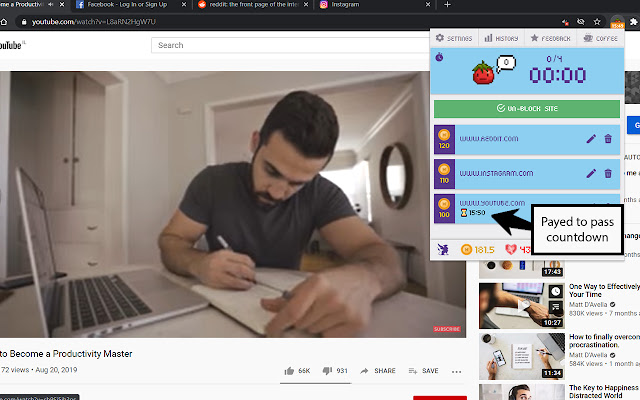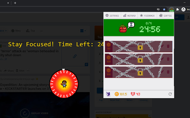 安装扩展程序后,单击右上角的图标以打开菜单。在这里,您必须设置您的 API 凭证。然后,您可以通过导航到某个站点并单击阻止站点来阻止该站点。它会要求您输入费用。从现在开始,当您访问此站点时,扩展程序将询问您是否愿意花费 GP 来访问它。要启动番茄钟计时器,只需单击番茄字符即可。再次单击以停止计时器。在设置中,您会找到很多选项,可让您调整和更改番茄钟行为以最适合您。