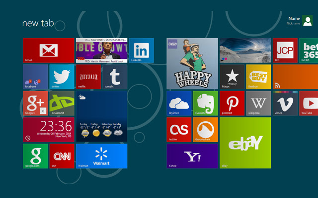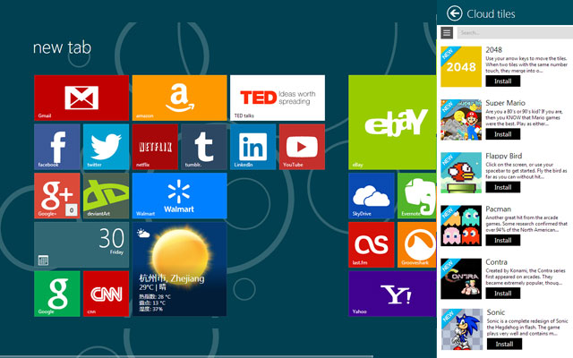 可定制的Metro风格的新标签页,提供了快速拔号,SNS、邮件提醒,天气,时钟等功能。