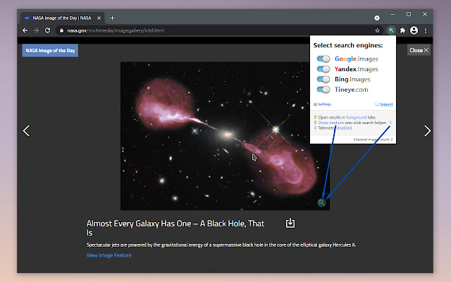 选择您首选的搜索引擎,右键单击图像(尚不支持可在线访问、本地文件和数据 URL)并选择“查找此图片”菜单项或仅使用一键搜索助手图标。它将打开带有结果的新标签。