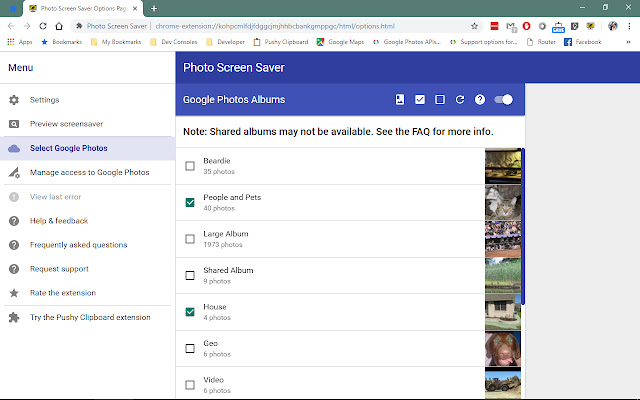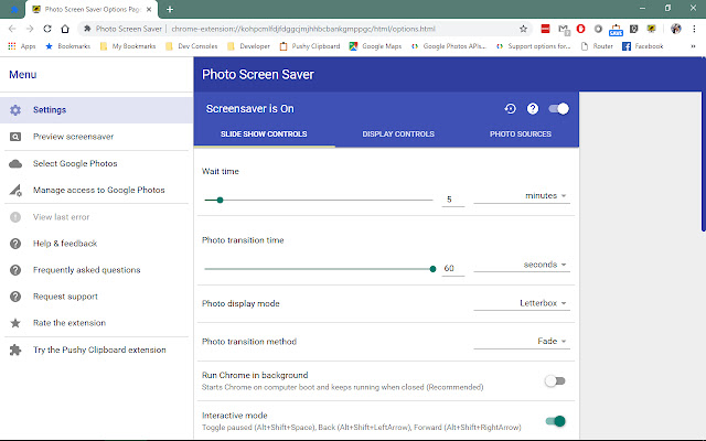 此扩展程序显示由来自多个来源的照片幻灯片组成的屏幕保护程序。支持的照片来源包括: