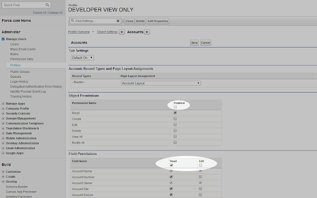 最初,此扩展程序仅在配置文件和权限集的对象设置页面上的对象权限和字段权限列表中添加复选框。未来版本会将功能扩展到其他设置区域。