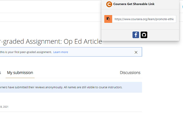 Coursera Get Shareable Link 是一个小型扩展,供 Coursera 学习者获取您提交的链接。这有助于加快评分过程,因为您可以邀请导师或其他人对您的提交进行评分