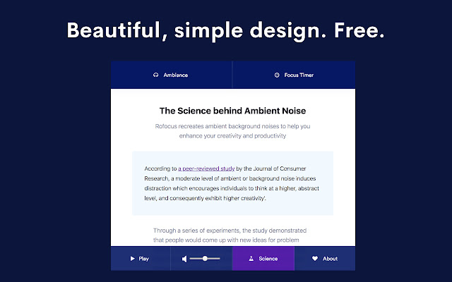 Rofocus 重现环境背景声音,旨在帮助您提高注意力和创造力。此外,该工具还带有一个设计精美的类似番茄钟的对焦计时器,可帮助您保持正轨并提高工作效率。屏蔽所有干扰,听听被证明可以帮助您集中注意力的音乐。它也是完全免费的。
