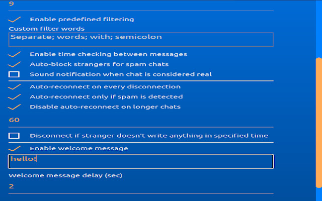 此扩展程序不仅允许您过滤掉此类聊天,还使您能够在任何断开连接后立即自动重新连接并开始新的聊天。您甚至可以设置自己的欢迎信息。
