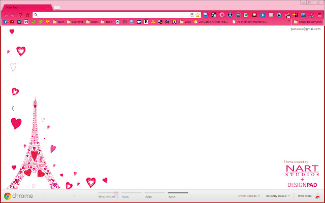 此主题适用于所有现代 Google Chrome 浏览器。它具有由 DesignPad 设计的由数百颗心制成的埃菲尔铁塔插图,不得在未事先联系我们任何一个人的情况下使用(联系信息如下)。主题的其余部分采用粉红色配色方案,背景中带有心形额外的心形。