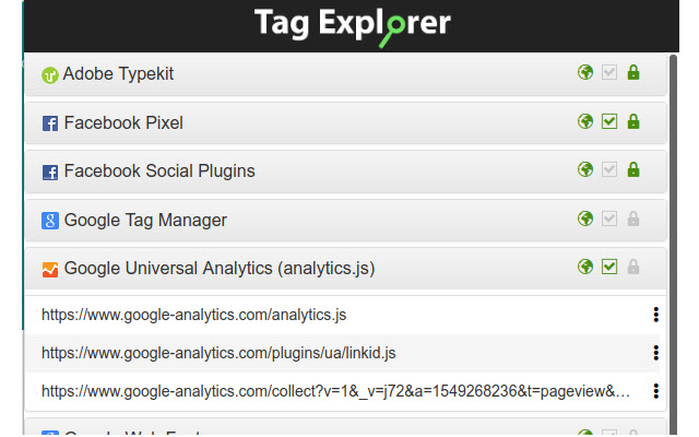 Tag Explorer 是一种工具,可显示您当前正在查看的页面上正在运行哪些营销标签以及正在触发哪些信标。无论您是想确保您的分析标签被触发,检查捎带标签和第三方跟踪器,还是要查看每个标签如何加载的层次结构,标签浏览器都是您所有网站审核和隐私的完美扩展需要。