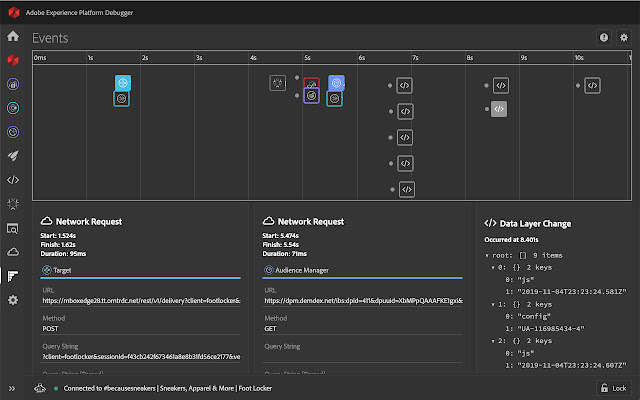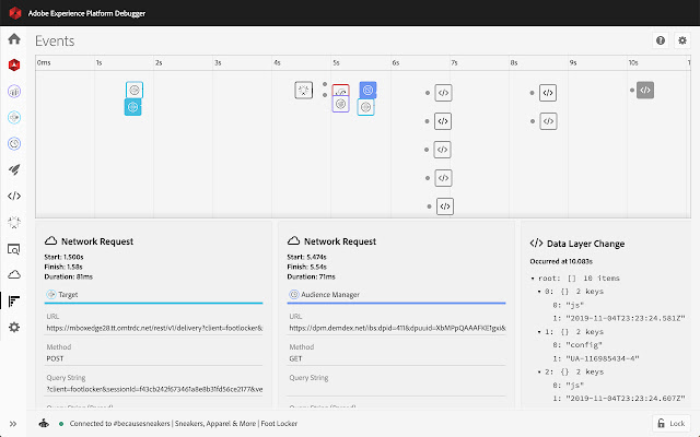 在每次 Adobe 网络调用的同时查看时间线上的数据层更改,以便更轻松地调试数据。