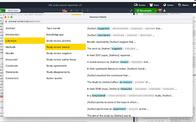 • 除了语言检查之外,该扩展还提供了一系列科学写作中非常常用的示例短语和句子:句子调色板。