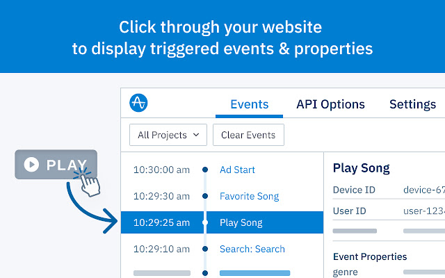 事件资源管理器允许您在 Web 应用程序中实时浏览事件、事件属性和用户属性。单击时间线内的事件以进一步探索事件数据。单击 API 选项选项卡以进一步探索您的 SDK 配置。