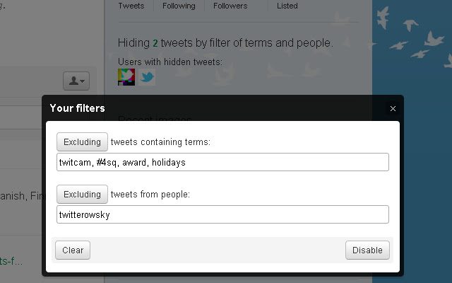 - 推文不会被删除,只是被隐藏,因此您可以随时通过禁用过滤器或更改条件来取回它们。