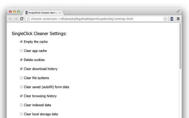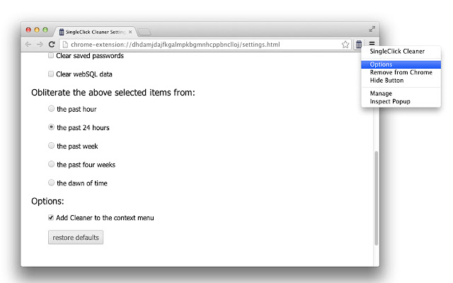 * 请注意,SingleClick Cleaner 只会删除 chrome 历史记录,但不会干扰您的 google 历史记录(您在 google.com 上的搜索历史记录)。要处理您的谷歌搜索历史,您应该在搜索引擎中访问您的帐户并从那里处理谷歌历史)