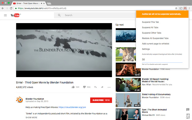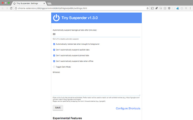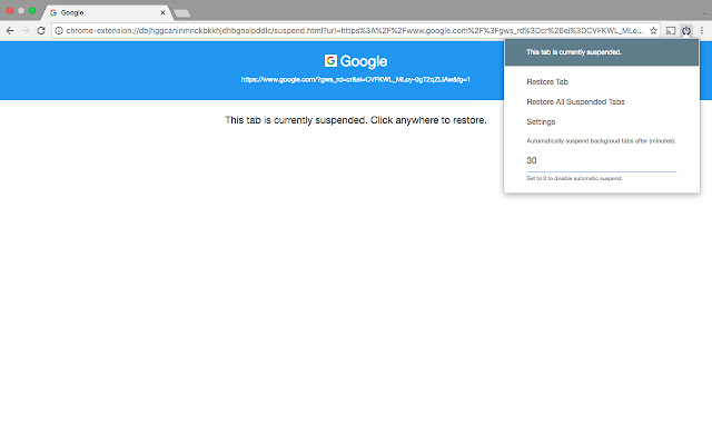 Tiny Suspender 会自动为您暂停/休眠后台选项卡,大大减少整体系统资源的使用,而您无需采取任何行动。您可以设置在暂停空闲标签之前等待多长时间,并配置白名单以从自动暂停中排除某些页面。