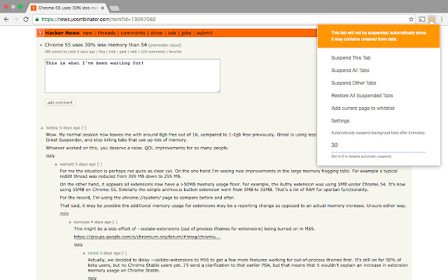 - 表单检测:Tiny Suspender 也会尝试检测活动表单以避免自动暂停未提交表单的页面