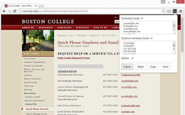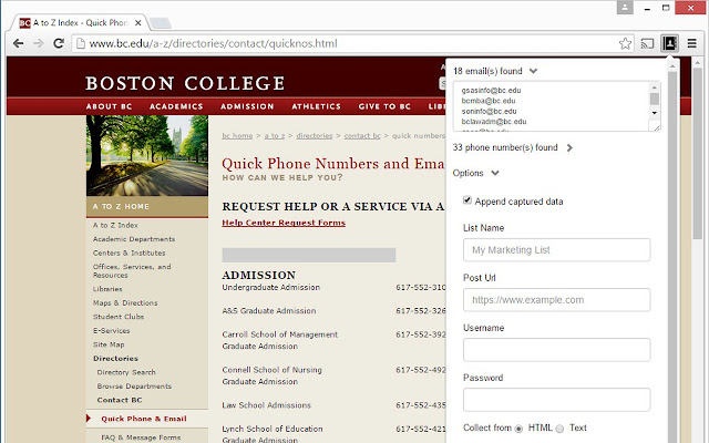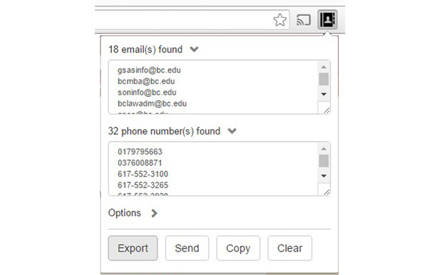 只需单击扩展图标即可自动提取当前网页上显示的所有电子邮件地址和电话号码。电子邮件导出器可以配置为在 html 或文本中查找匹配数据。