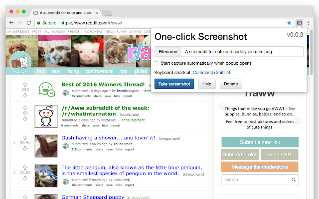 这个扩展非常简单。只需点击几下,您就可以截取整个网站的屏幕截图并将其保存为 png 文件。没有膨胀或任何花哨的后期处理。您还可以使用键盘快捷键。