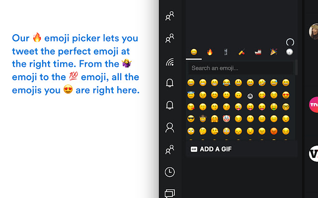 Tweeten 带有内置的 GIF 搜索功能,可让您从 Giphy 上传任何 GIF。我们的 ? 表情符号选择器可让您在正确的时间发布完美的表情符号。从?表情符号到?表情符号,你?的所有表情符号都在这里。