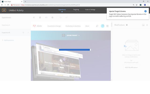 - 如果网页尚不包含 Target at.js JavaScript 库,您可以使用扩展程序注入库,以便为网站创作体验。然后,您可以使用 pview 链接创建活动并对其进行 QA。