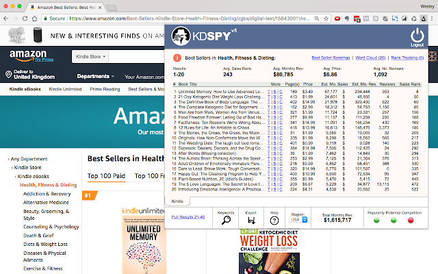 KDSPY 是一个节省时间的研究伙伴,它允许作者找到有利可图的书籍创意、亚马逊类别和关键字。
