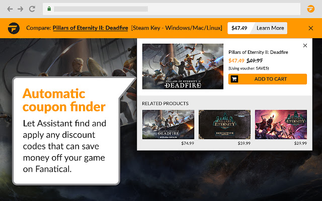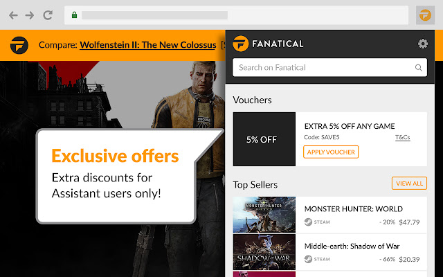 当您正在浏览的游戏在Fanatical上更便宜时,这款易于使用的扩展程序会自动通知您。最重要的是,它为您提供独家促销代码,这样您就可以花更少的钱来充实您的Steam库。