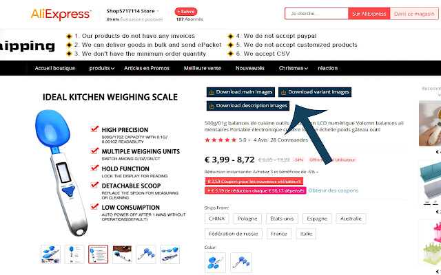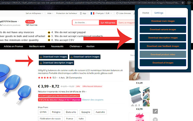 您将在 AliExpss (阿里巴巴) 产品页面或扩展程序的弹出菜单中看到下载按钮。
