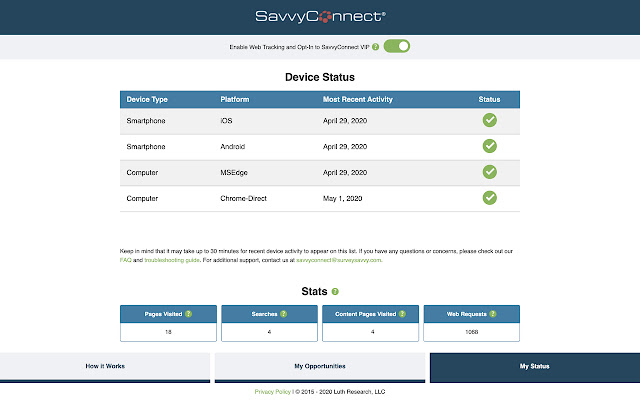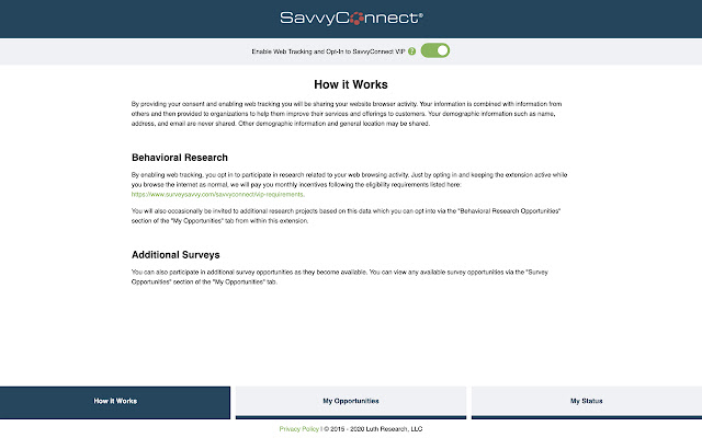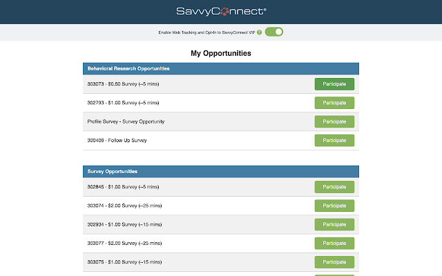 安装扩展程序后,您会立即加入 SavvyConnect 行为研究面板,并且您将获得额外的付费研究机会。 SavvyConnect 还提供对您所有调查邀请的即时访问。