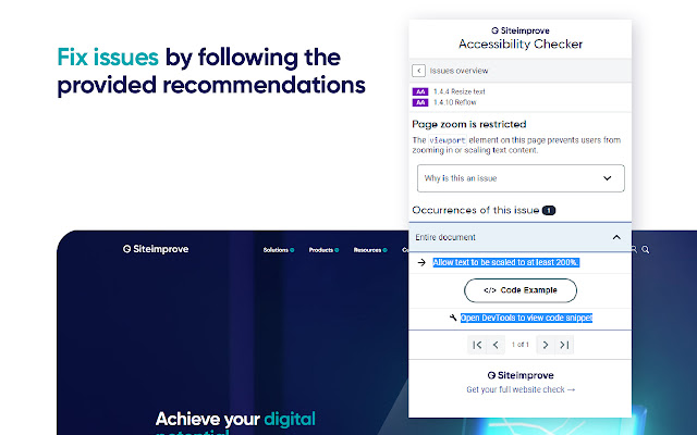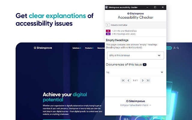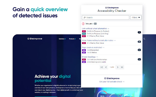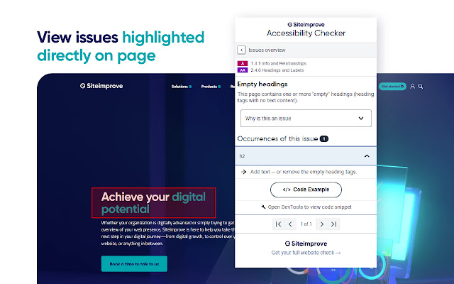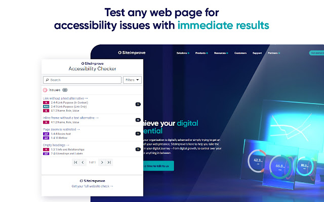 Siteimprove Accessibility Checker 可让您直接在 Google Chrome 中轻松检查任何网页的可访问性,因此您可以根据最新的 ACT(可访问性一致性测试)规则立即识别问题,并提供即时反馈和建议。