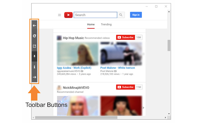 YouTube™ 浮动面板在单独的窗口(浮动窗口)中打开 YouTube 官方页面,该窗口将位于其他打开的窗口之上。这样,在浏览其他网站时使用 YouTube 非常容易。浮动窗口的左侧有一个带有 5 个按钮的工具栏。