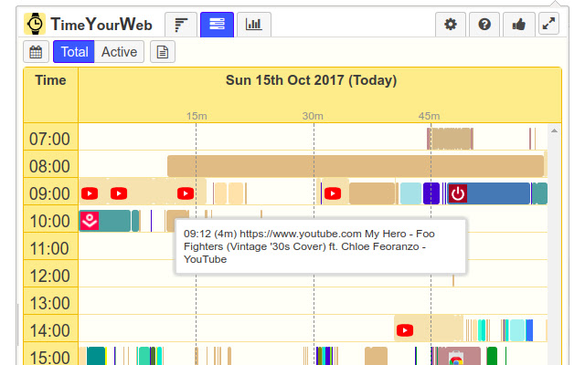扩展区分“总”和“活动”时间跟踪方法。如果您在 30 秒内按 ps 键或移动鼠标的频率超过 1 次,则时间将被跟踪为“活动”。如果用户处于非活动状态超过 30 秒但浏览器处于焦点状态,则 TimeYourWeb 仅计算“总”时间。 “总”时间显示您在 YouTube 或其他视频共享网站上观看视频的时长,或者只是让浏览器保持打开状态。
