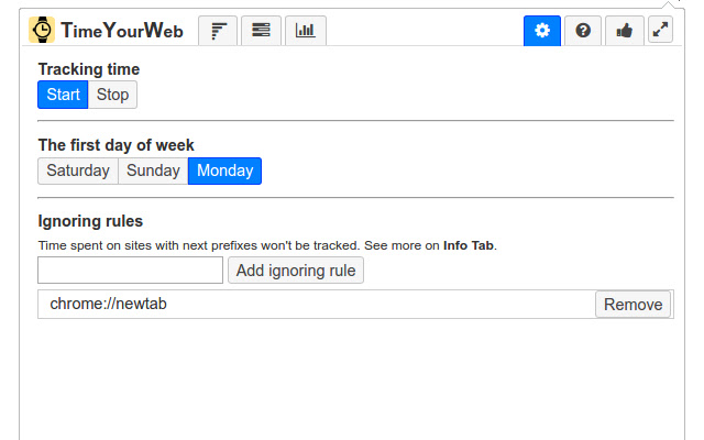 3) 定义不会被跟踪的 URL。 TimeYourWeb 检查每个 URL 是否与“忽略规则”对应。如果 URL 开始和“忽略规则”相等,则 URL 将被忽略。