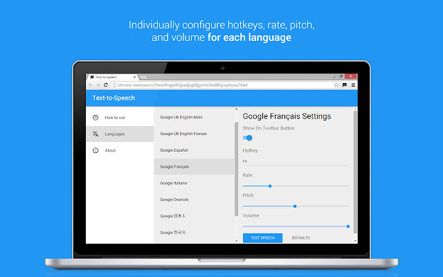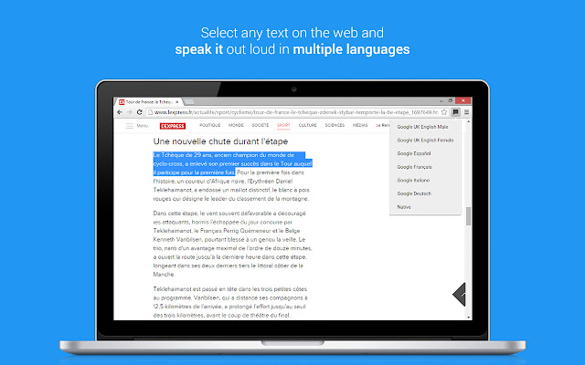 选择网络上的任何文本并用多种语言大声说出来。非常适合提高发音。向您的朋友推荐此扩展程序。
