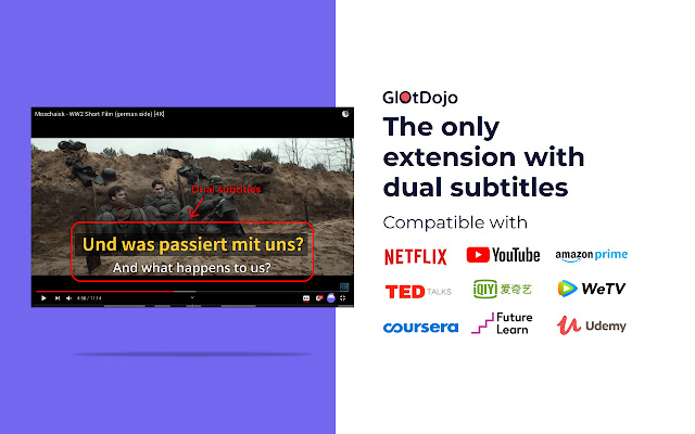 Glot Dojo 支持在 YouTube、Netflix、WeTV、Coursera、Amazon prime 等上进行翻译,从而使观看电影变得有用。