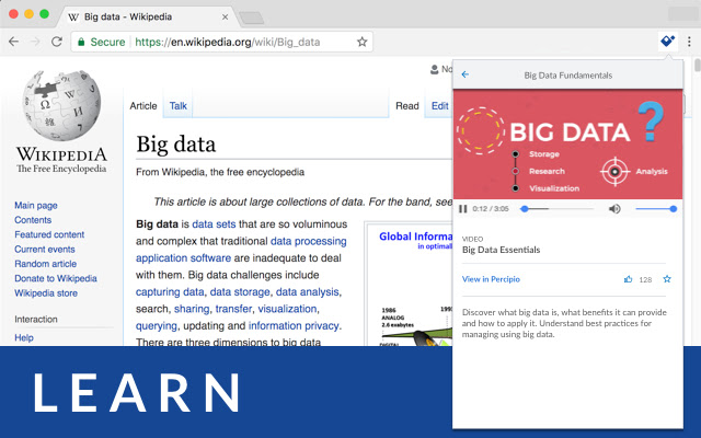 使用 Percipio ELSA,您可以在另一个 Web 应用程序中工作时,通过搜索、查找和观看课程和微学习视频、阅读书籍和收听有声读物来及时学习。 Percipio ELSA 还可以帮助您在浏览其他网站时回答问题和查找学习内容。