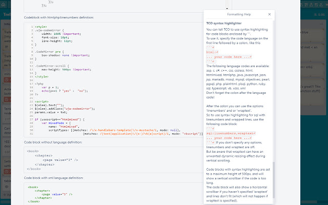 您可以告诉 TCO 对由 ``` 括起来的代码块使用语法突出显示。