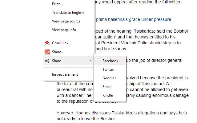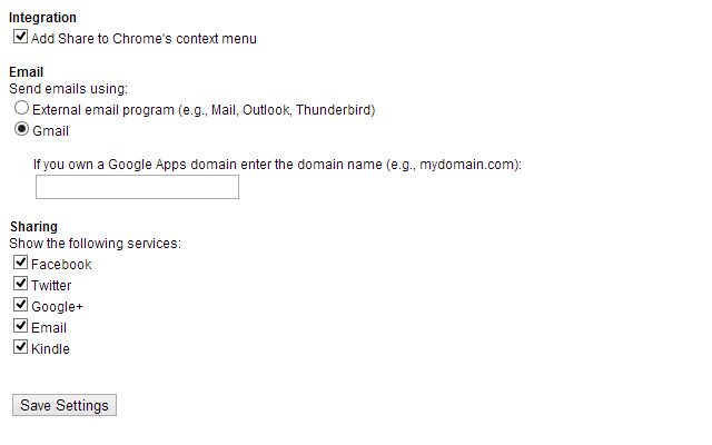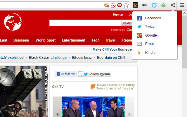 使用此扩展程序与使用 Facebook、Twitter、Google+、电子邮件(无论是您的电子邮件客户端还是 Gmail)的其他人共享网页、图像或链接,或将其发送到您的 Kindle 以供以后阅读。