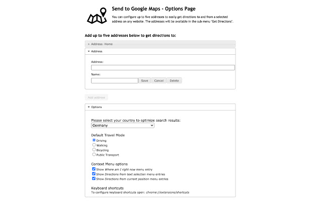 只需转到选项页面并输入最多五个最喜欢的地址即可。它们将在上下文菜单中可用,以轻松获取路线。