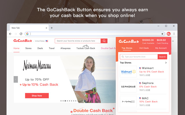 安装官方 GoCashBack.com 扩展程序,让在线现金返还购物变得前所未有的轻松。