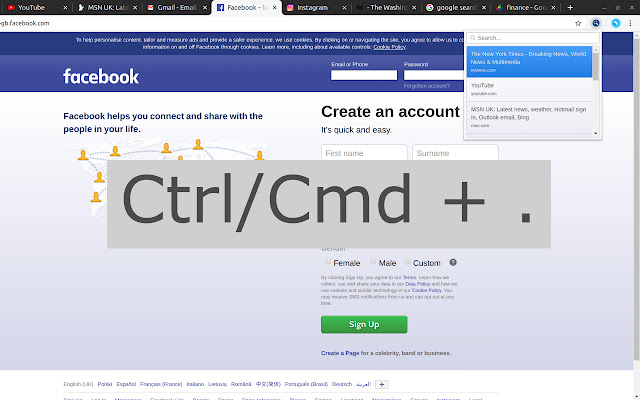 Ctrl/Cmd+。快捷方式打开选项卡搜索弹出窗口。使用箭头键导航选项卡,然后使用 Enter 键切换到所选选项卡。
