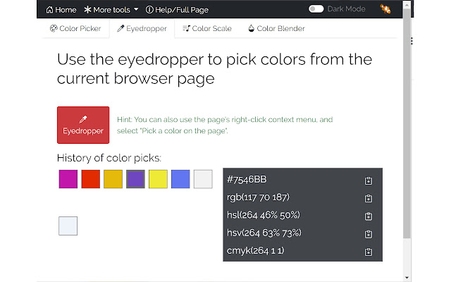 通过右键单击页面并选择“在页面上选择颜色”来使用吸管。您还可以使用扩展程序弹出窗口的吸管选项卡上的吸管按钮。