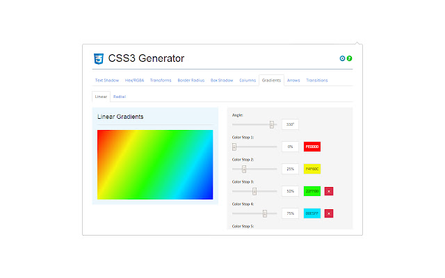 每个部分都有方便的滑块(如果适用)来为每个 CSS 属性和渐变选择所需的值,您可以快速轻松地添加和删除色标以创建完美的渐变!