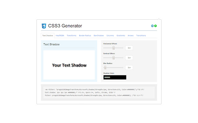 CSS3 Generator 是一个方便的扩展,它可以为你的 CSS 创建你需要的代码。它目前为以下 CSS3 属性生成跨浏览器(尽可能)代码:
