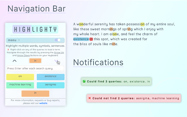 在您搜索的每个网页上立即获得有关找到或未找到的搜索查询的通知。在万维网上搜索时不再浪费时间和不必要的操作!