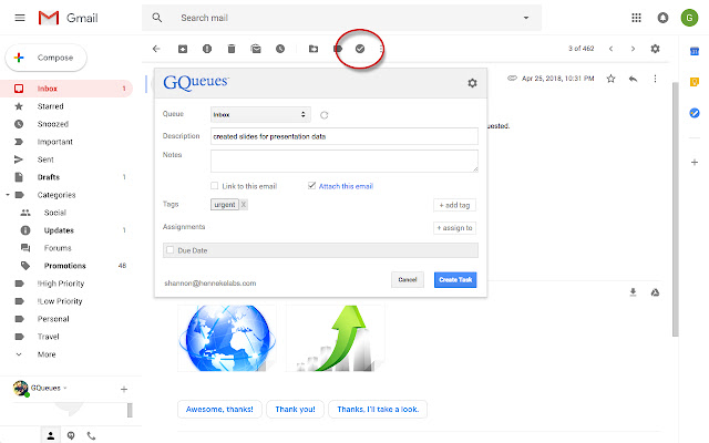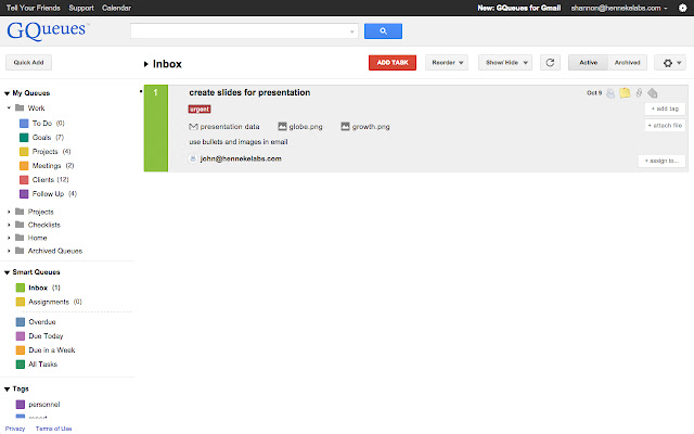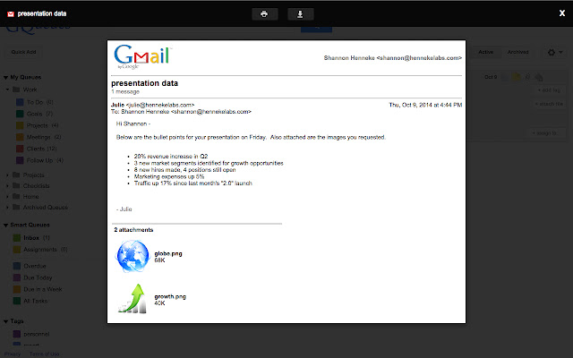 链接到电子邮件,或将电子邮件附加到任务并直接在 GQueues 中查看。非常适合与他人共享或分配任务。