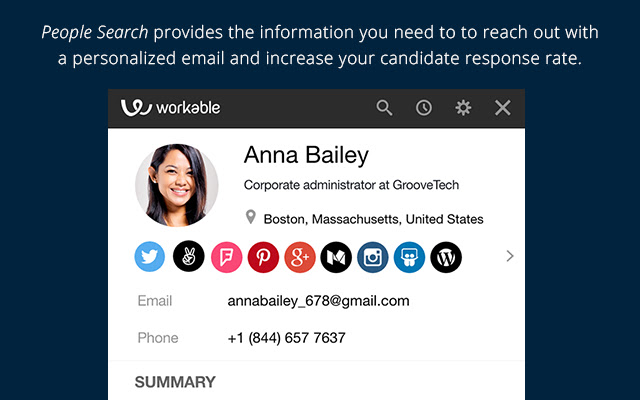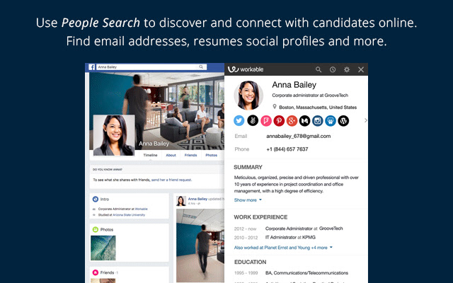People Search 改变了候选人的采购方式。通过此 Chrome 扩展程序进行的一次搜索会自动实时扫描数百万个在线配置文件和多个受信任的数据源。结果是一份详细的候选人资料,其中显示了电子邮件地址、简历等。在线查看配置文件,或下载为 PDF。将候选人资料直接添加到招聘渠道中的任何工作。