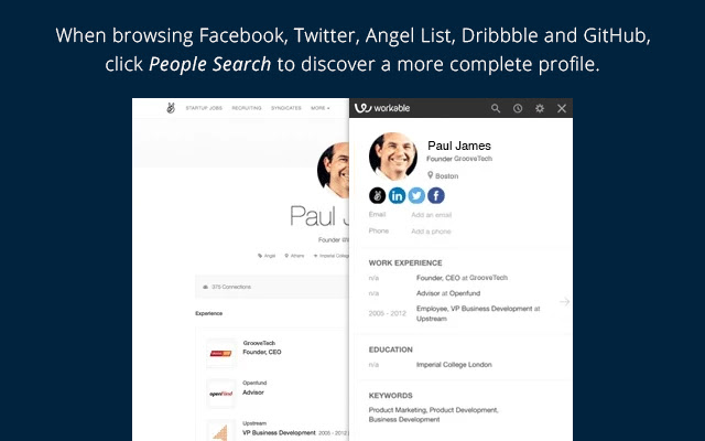 社交媒体资源:在 Facebook、Angel List、Twitter、Github、Dribbble 或 Behance 上查找任何个人资料。单击“人物搜索”图标可查看显示来自多个来源的数据的完整、详细的配置文件。